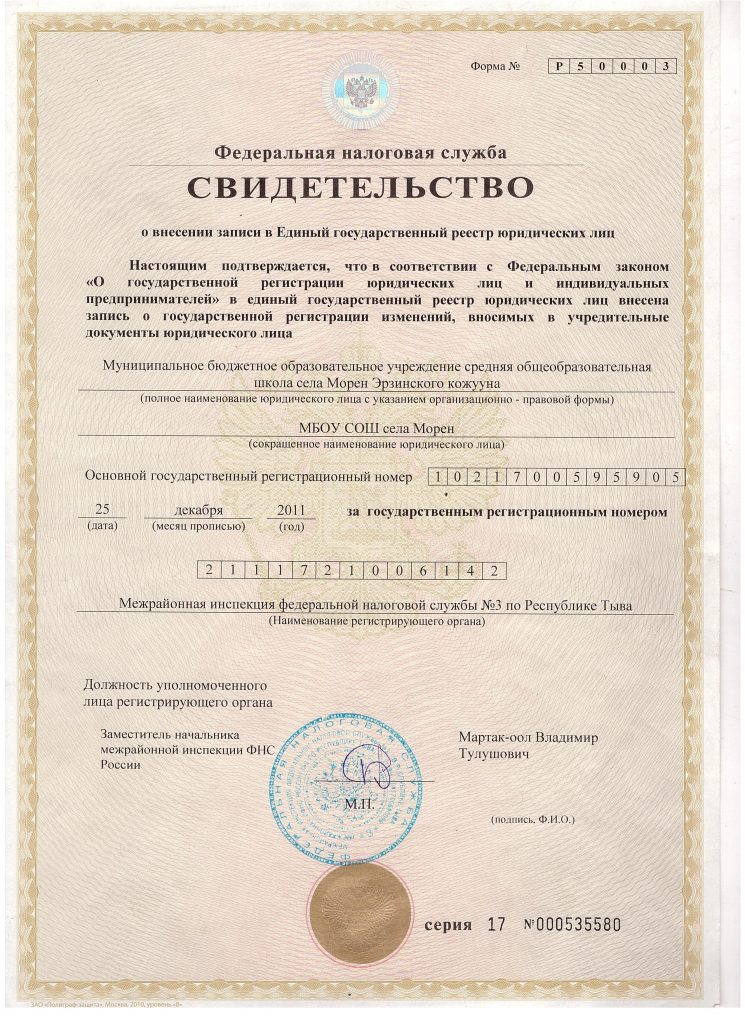 Свидетельство о внесении записи в Единый государственный реестр юридических лиц