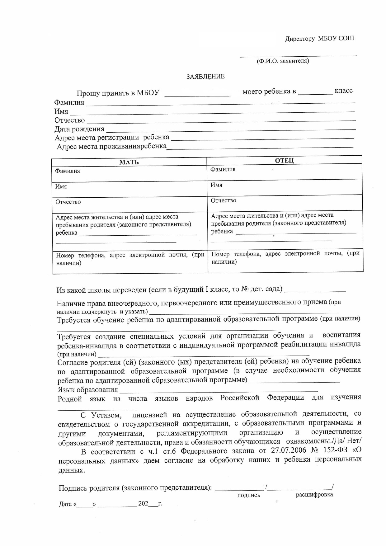 Форма заявления о приеме в школу