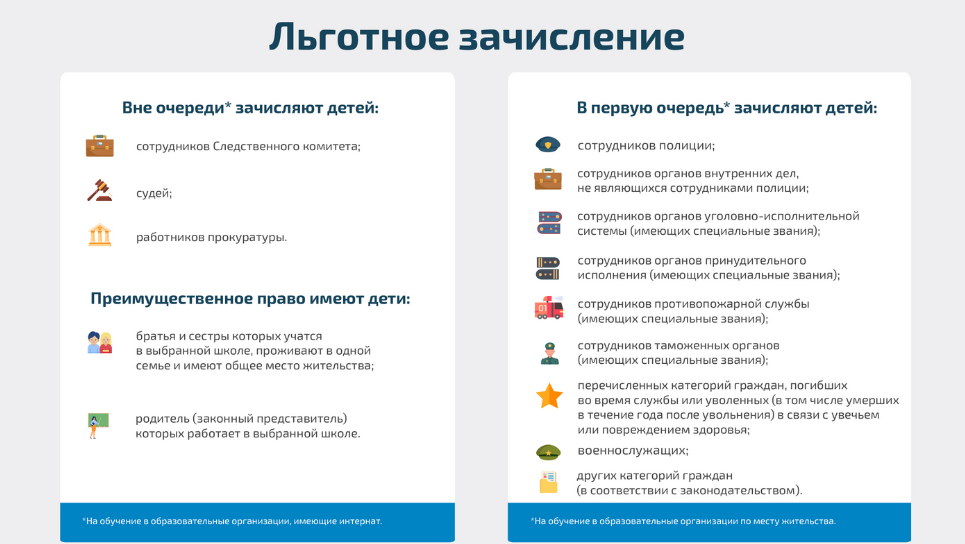 Льготами по зачислению ребенка в 1 класс обладают дети с первоочередным, преимущественным или внеочередным правом зачисления.